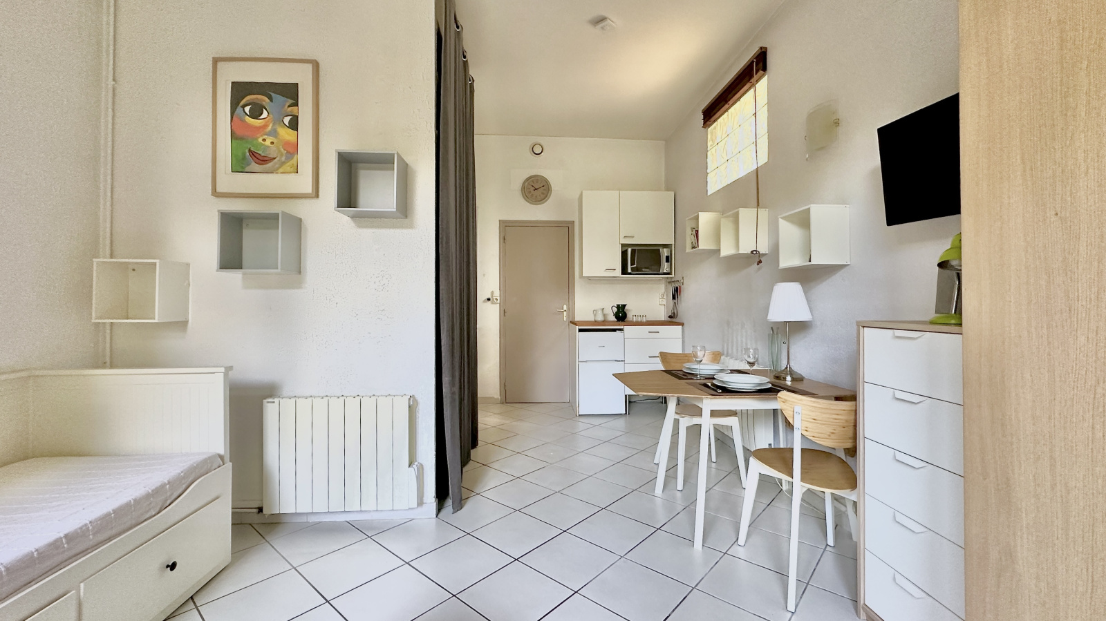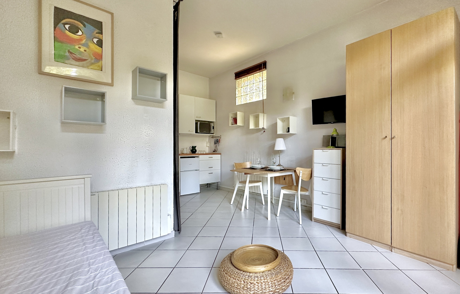 Il se compose d'une entrée, une pièce de vie donnant sur un balcon exposé plein Ouest, une cuisine équipée et une salle d'eau avec WC.