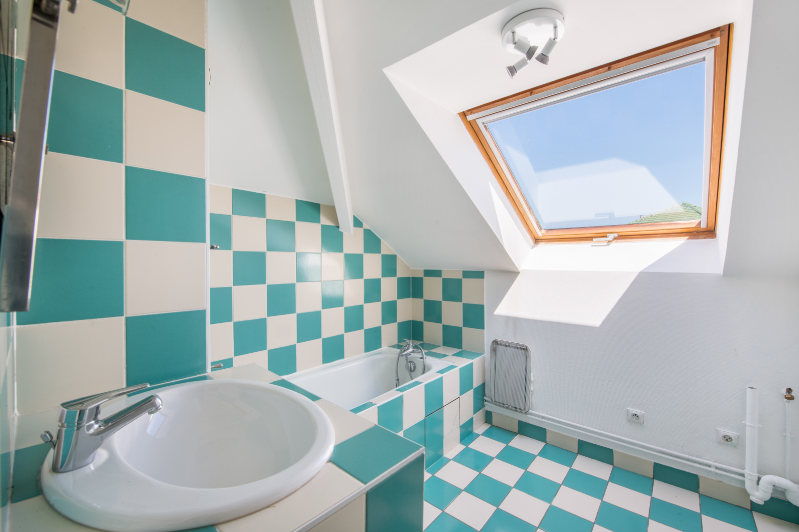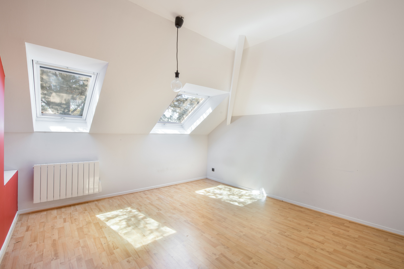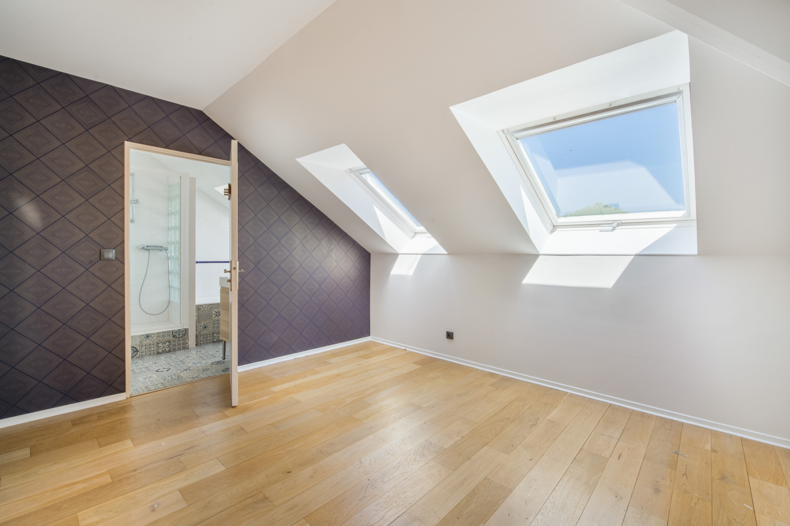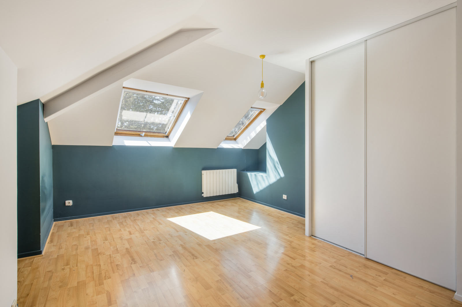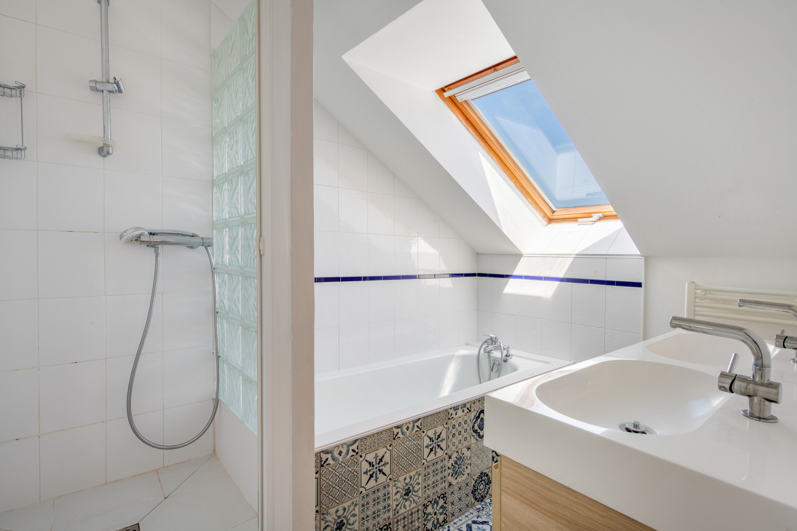 A l'étage, l'escalier propose des rangements, trois grandes chambres mansardées avec velux, dont une avec sa salle d'eau et baignoire, une salle de bain indépendante avec velux, un wc séparé et placards de rangements.